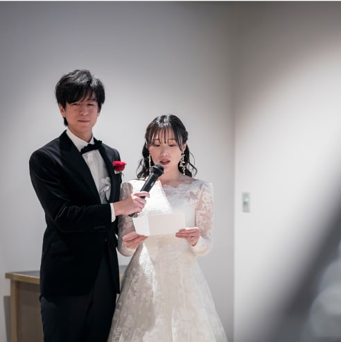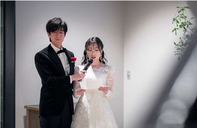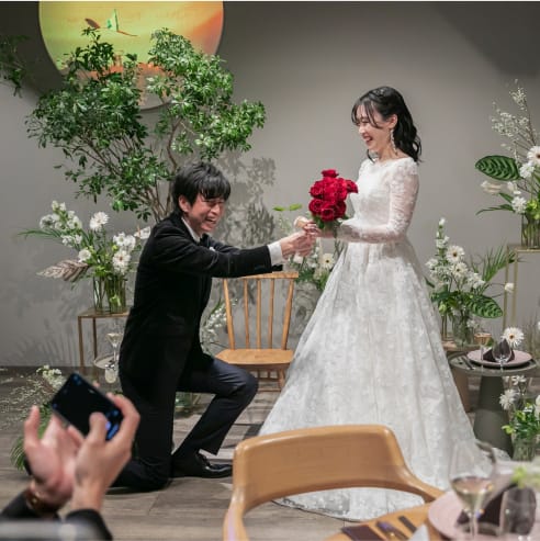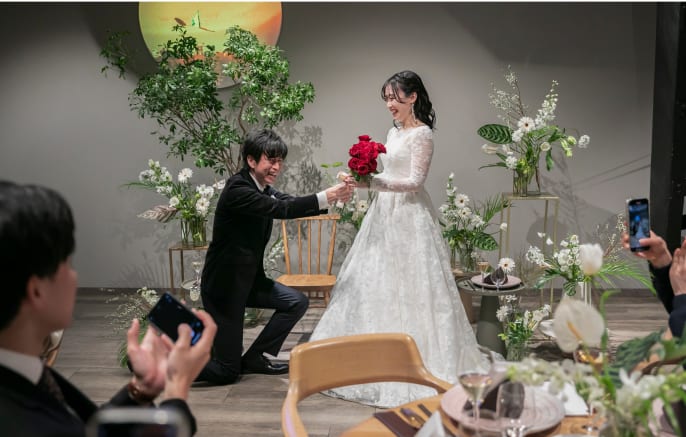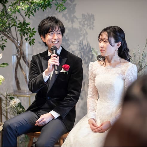 会食の始めにローズセレモニーの演出を取り入れました。ゲストから近い距離でおめでとうの言葉を受け取ることができ嬉しかったです。また両家の母へラストバイトをサプライズでおこないました。美味しいものをたくさん食べさせてくれた感謝を伝え、きっと母も驚きながらも喜んでくれたと思います。食事中心だったのですが、料理がすごく美味しくてゲストにも好評でした。私はドレスだったので途中で苦しくなったのも良い思い出です。(笑)