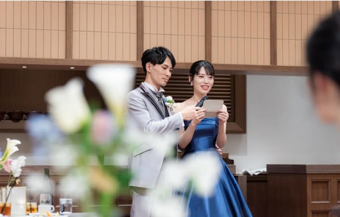 ブライダルフェアで提案してもらったお皿の下のメッセージや、家族へのお色直しエスコートをサプライズでお願いしました。昔から大好きな祖母とも一緒に歩けてよかったです。また会場を選ぶ決め手にもなった料理は妥協せずにコースを決めました。自分たちの旅行の思い出などを取り入れ、ゲストにも好評でした。