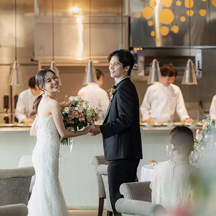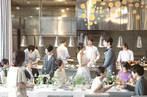 完全貸切なので、みなさまの目の前のオープンキッチンでお二人の結婚式のためだけの調理提供ができることが美味しさの理由です。